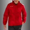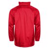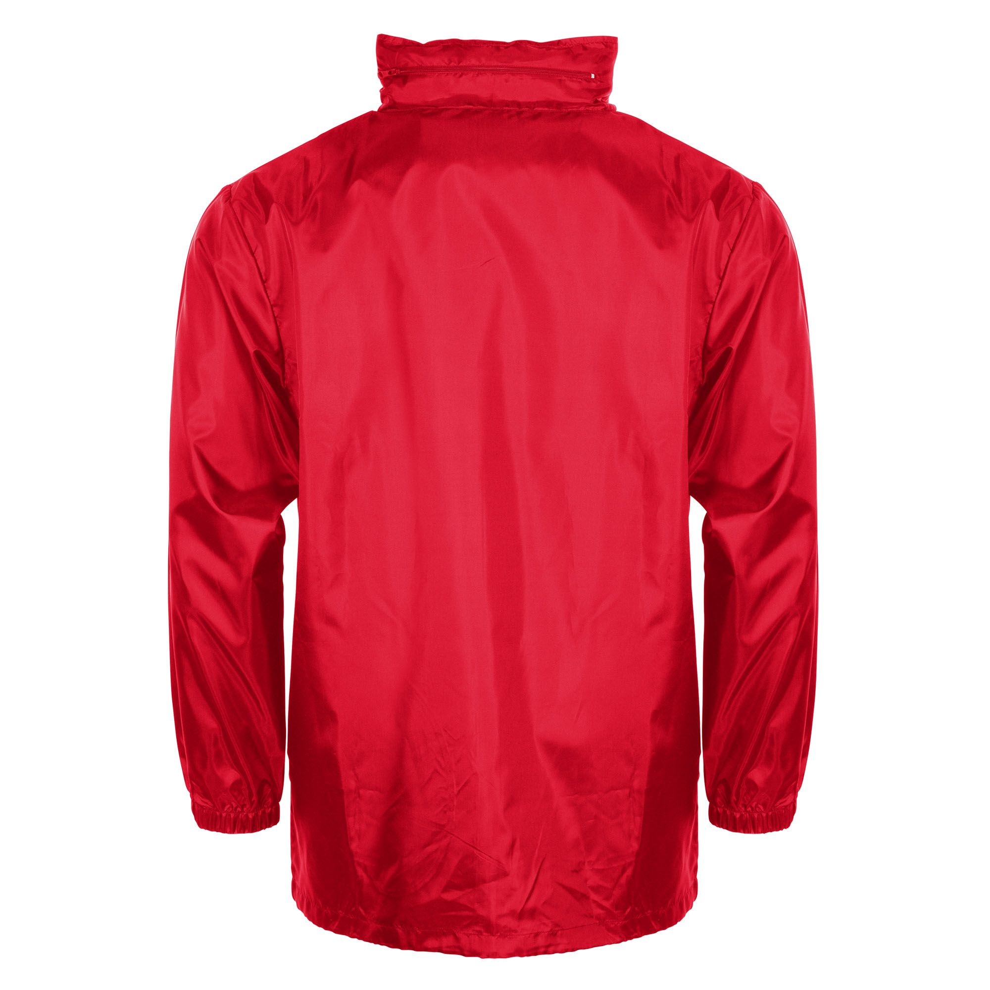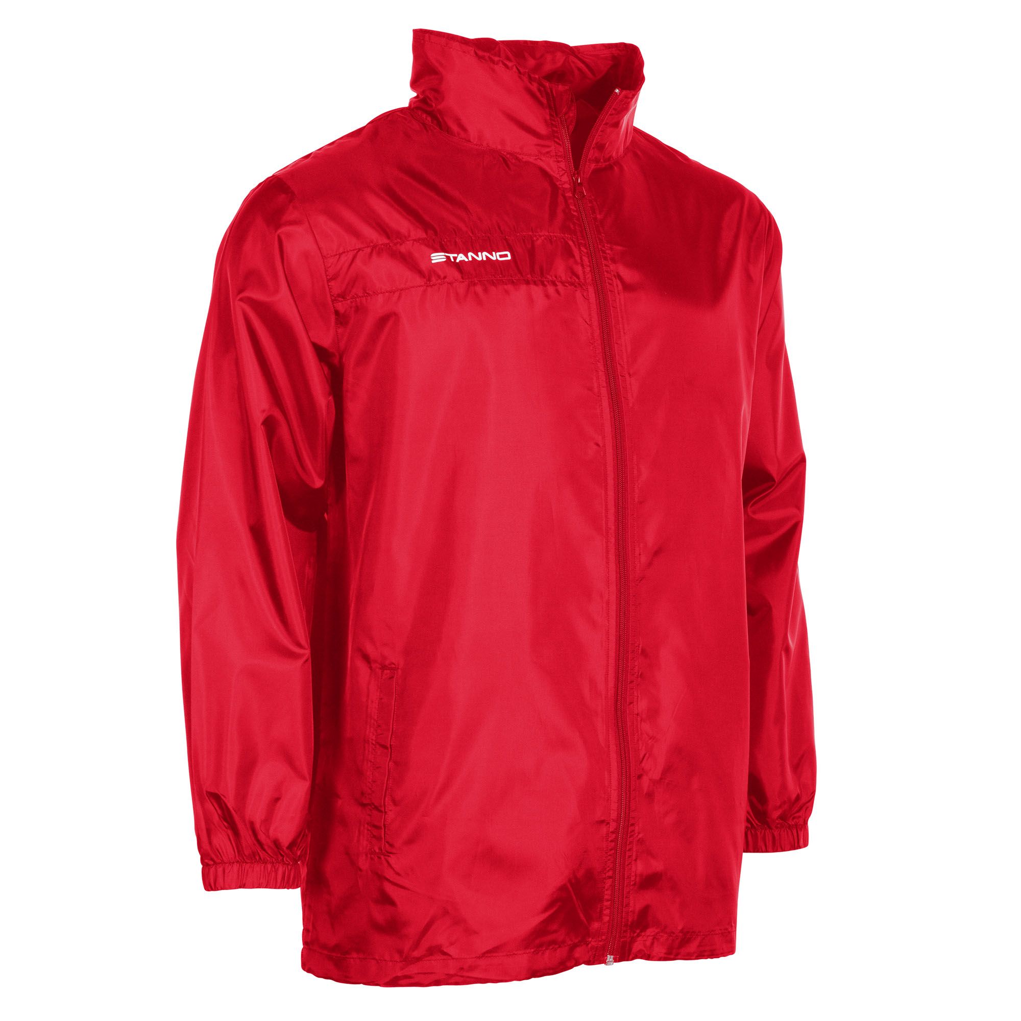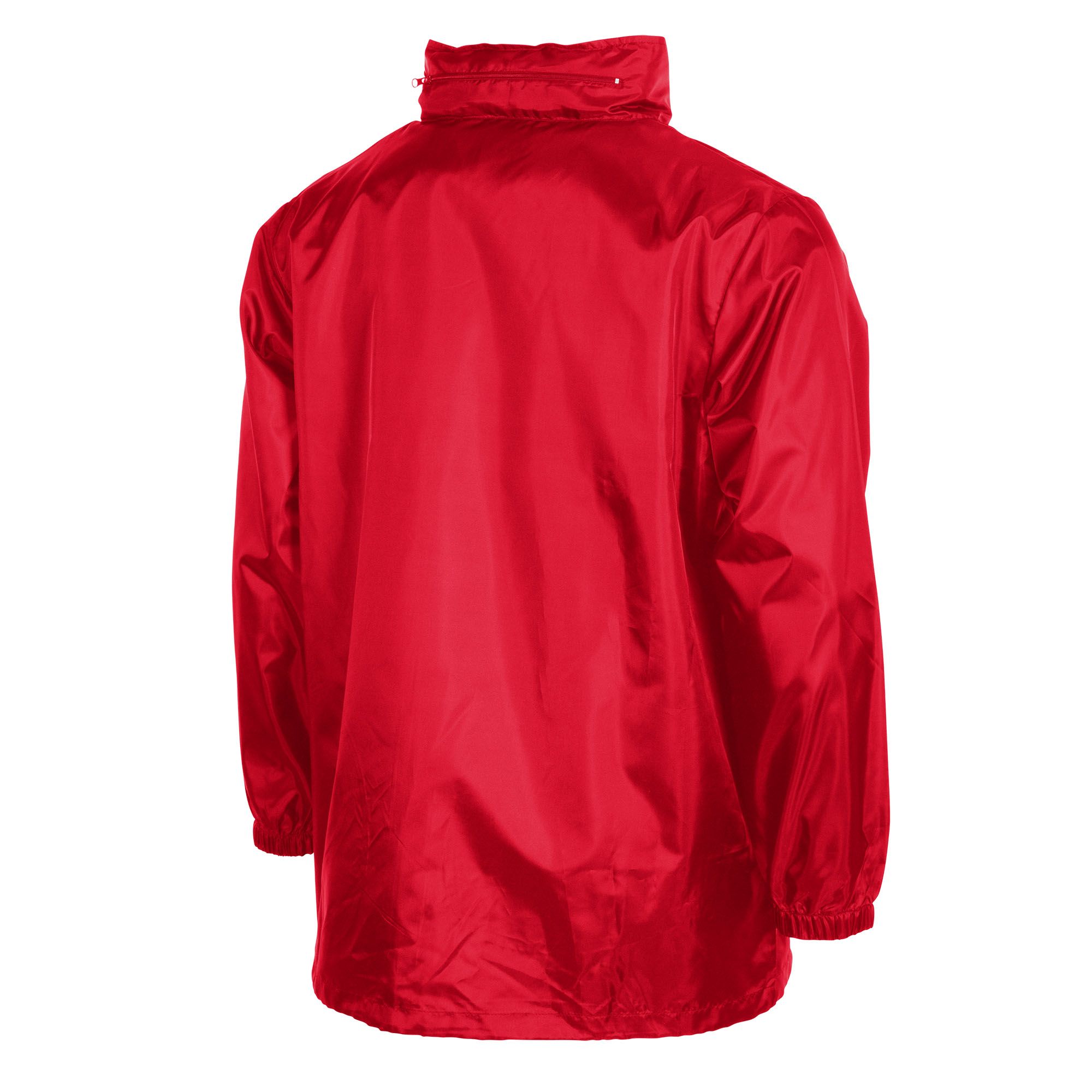 is made of 100% polyester, finished with a water-repellent coating (600mm PU). The body contains a 100% polyester mesh liner and the lining of the sleeves is 100% polyester tafetta. The jacket features elastic cuffs, a tunnel with drawstring at the bottom, two side pockets (without zip) and a hidden hood inside the collar. There’s a printed Stanno logo on the right chest and the opening for a print plate makes it easy to print on the back.