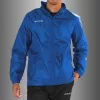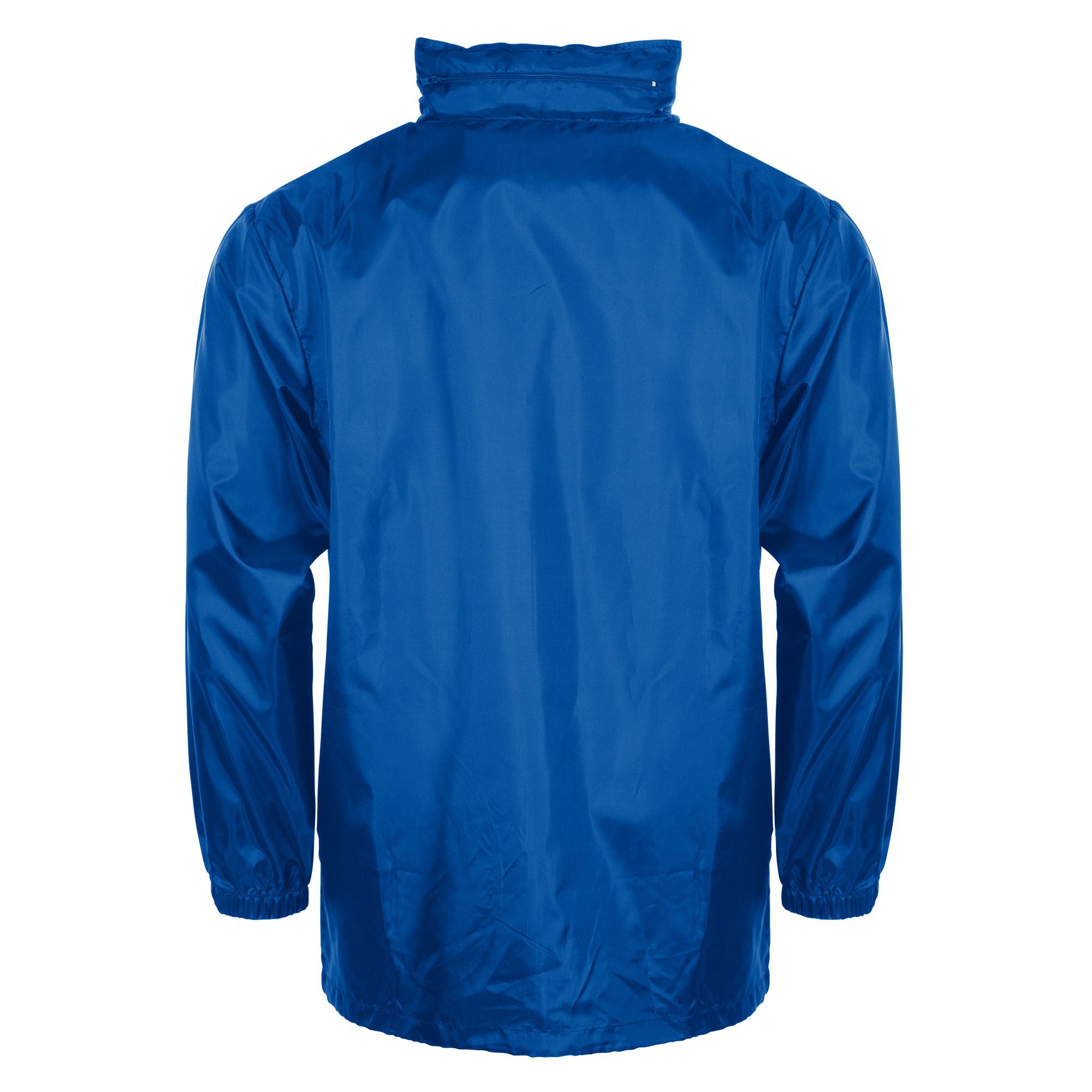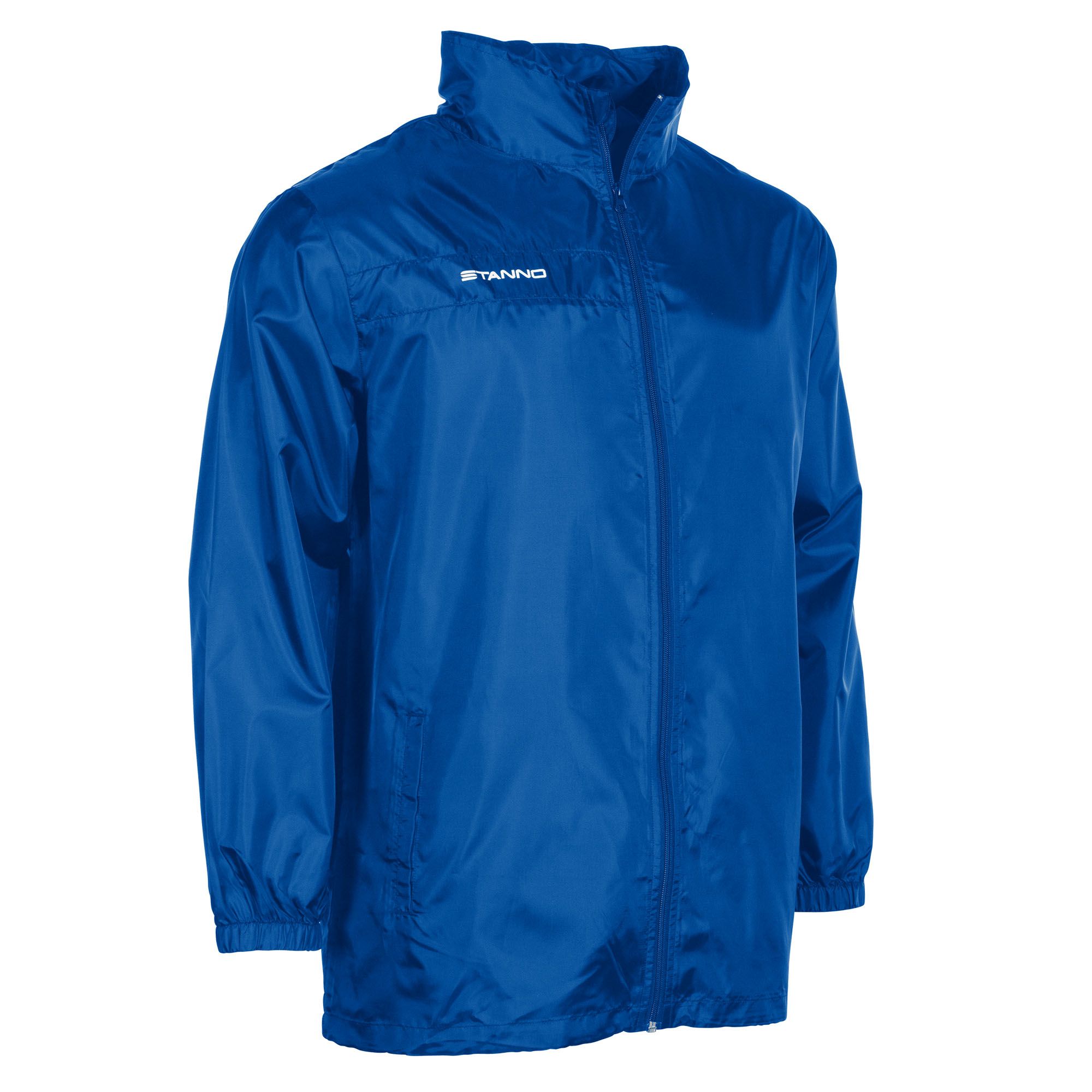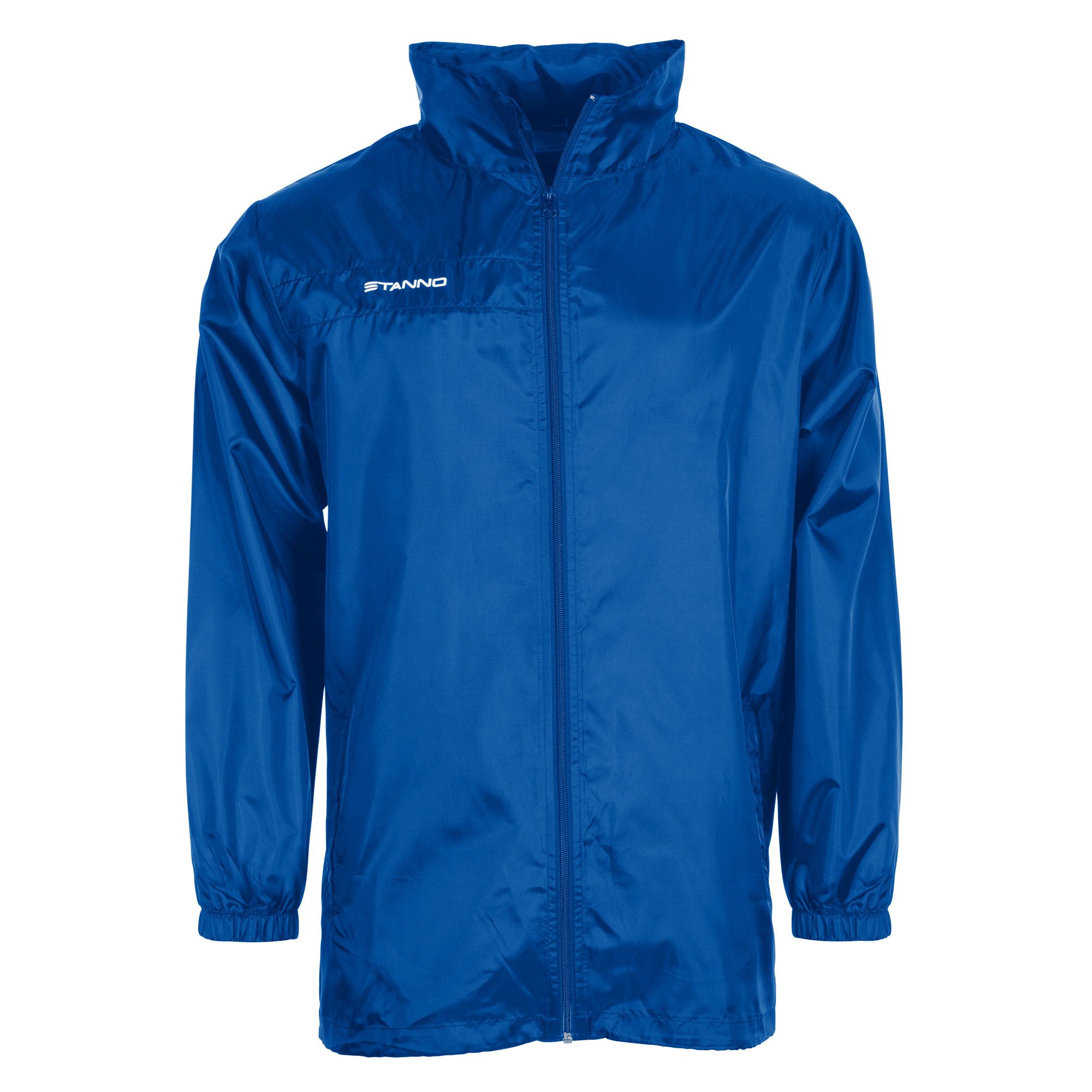 made of 100% polyester, finished with a water-repellent coating (600mm PU). The body contains a 100% polyester mesh liner and the lining of the sleeves is 100% polyester tafetta. The jacket features elastic cuffs, a tunnel with drawstring at the bottom, two side pockets (without zip) and a hidden hood inside the collar. There’s a printed Stanno logo on the right chest and the opening for a print plate makes it easy to print on the back.