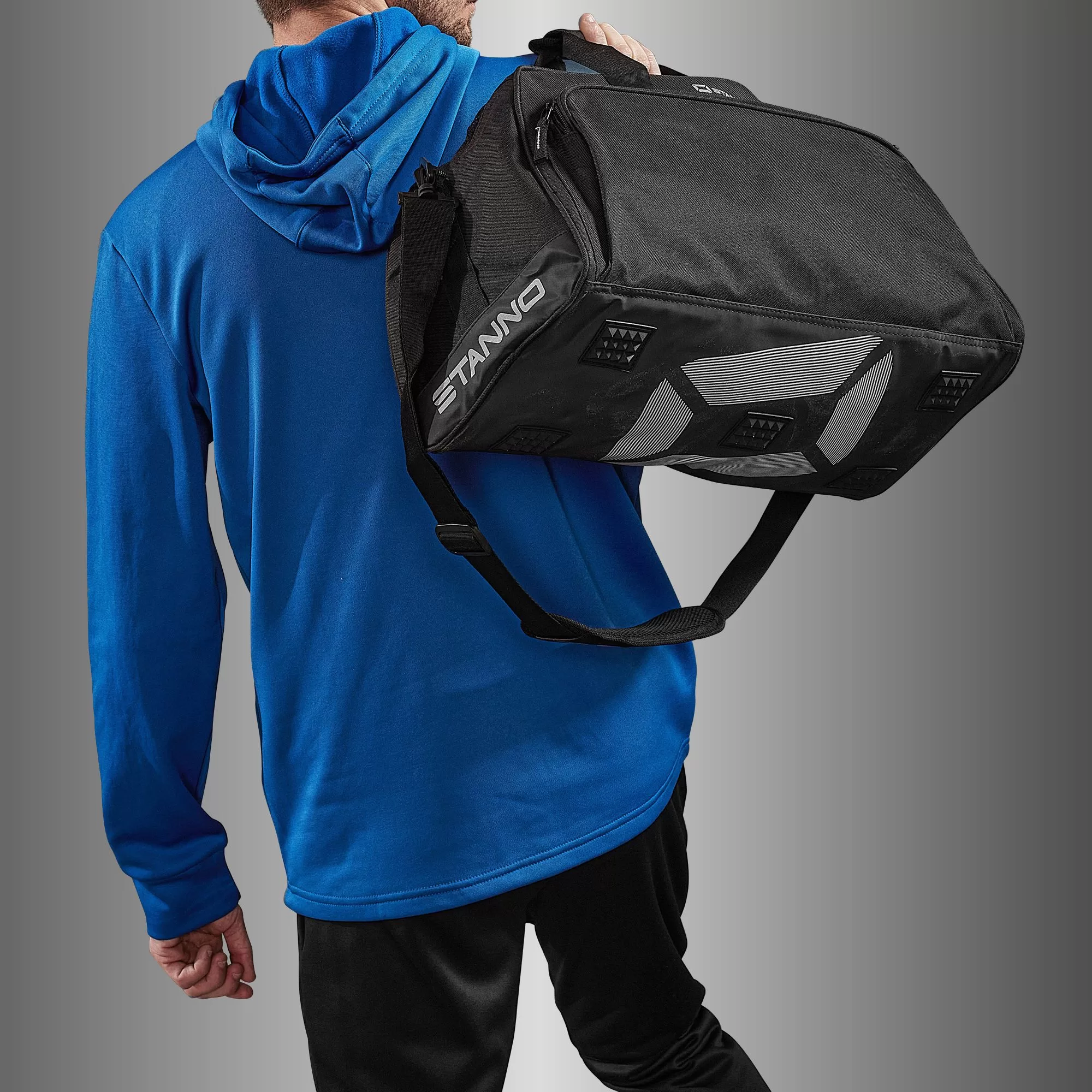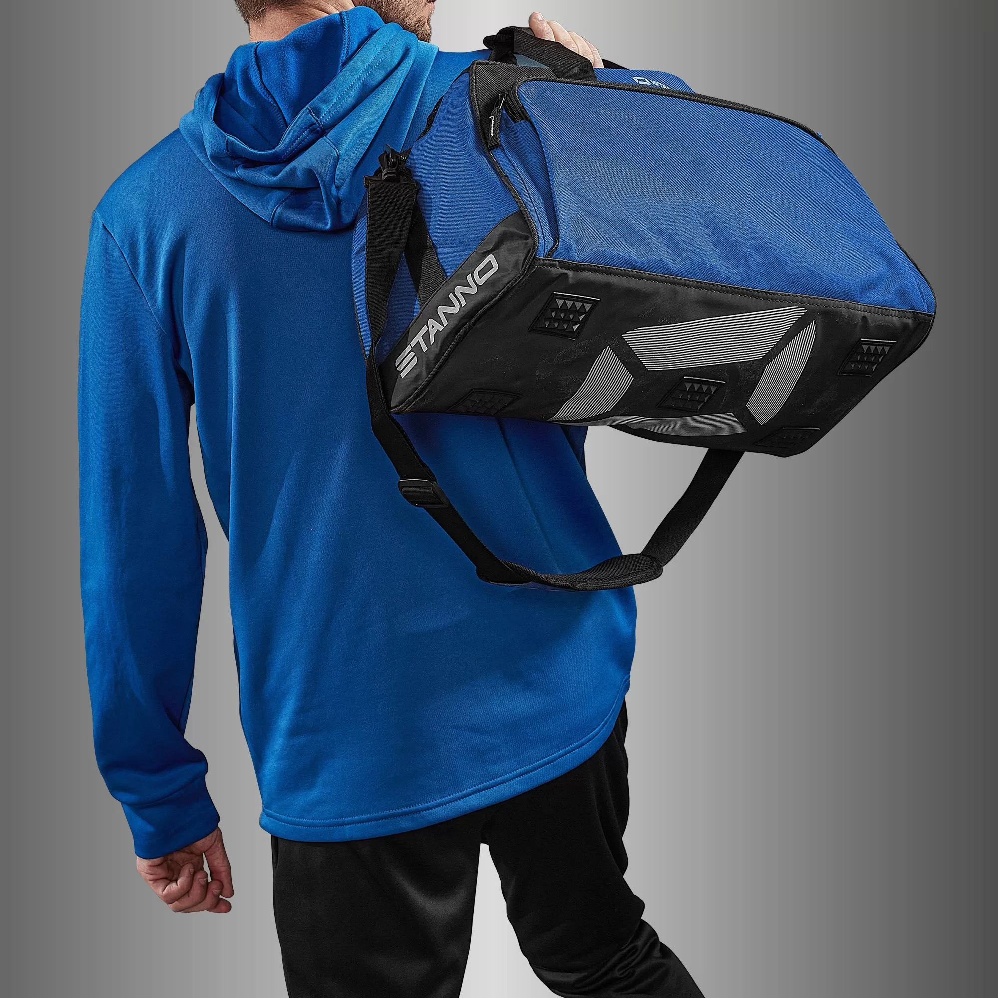 The Stanno San Remo Bag is crafted from high-quality 600D polyester, making it both durable and lightweight for everyday use. Designed with a two-way top zipper, it opens to a large reinforced inner compartment that offers reliable storage and protection for your belongings. For added practicality, it includes an extra front pocket and an additional inside pocket, perfect for keeping smaller items secure and organized. This model is the smallest in the San Remo series, with compact dimensions of 25 x 48 x 23 cm (H x W x D), making it ideal for sports, travel, or daily use. Finished in navy blue with a clean design, it is suitable for men, women, and youth alike.