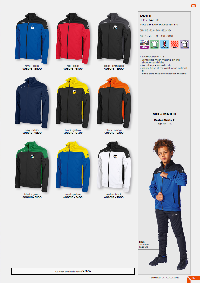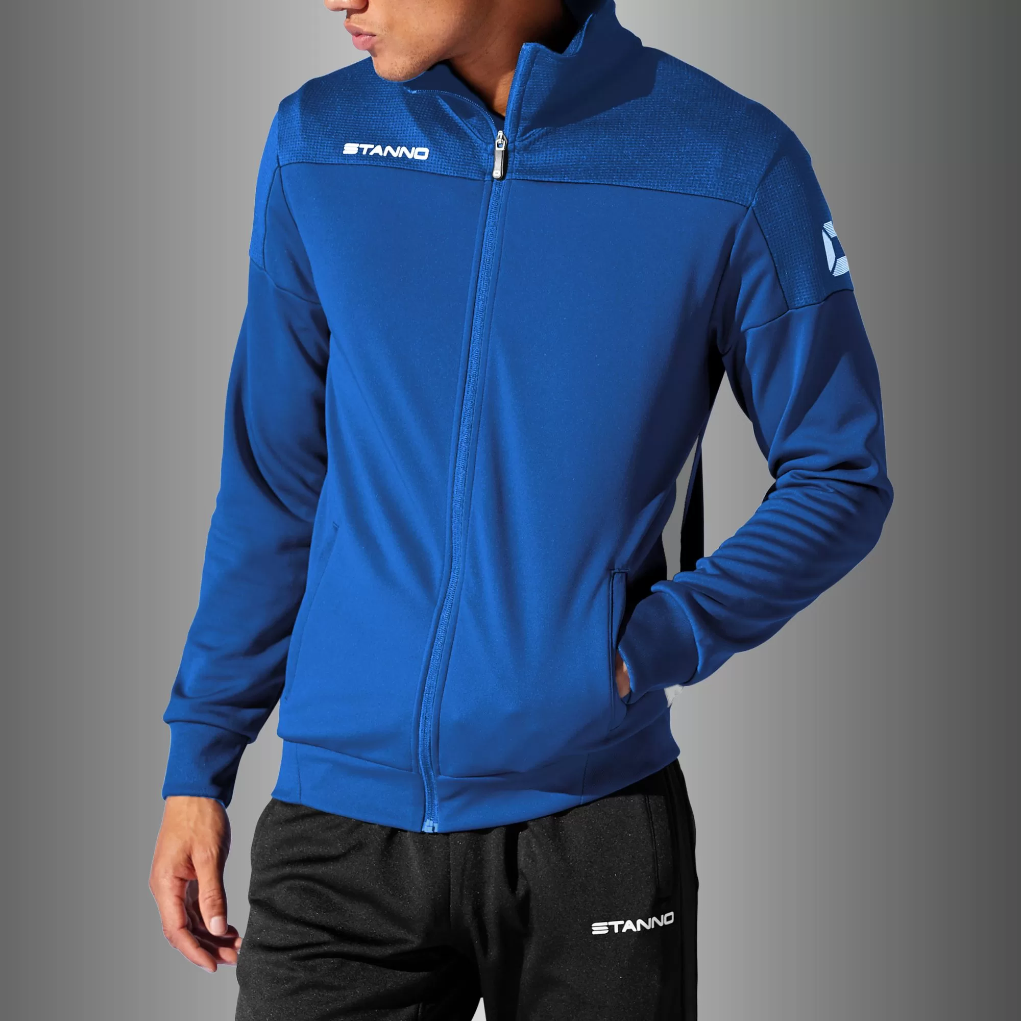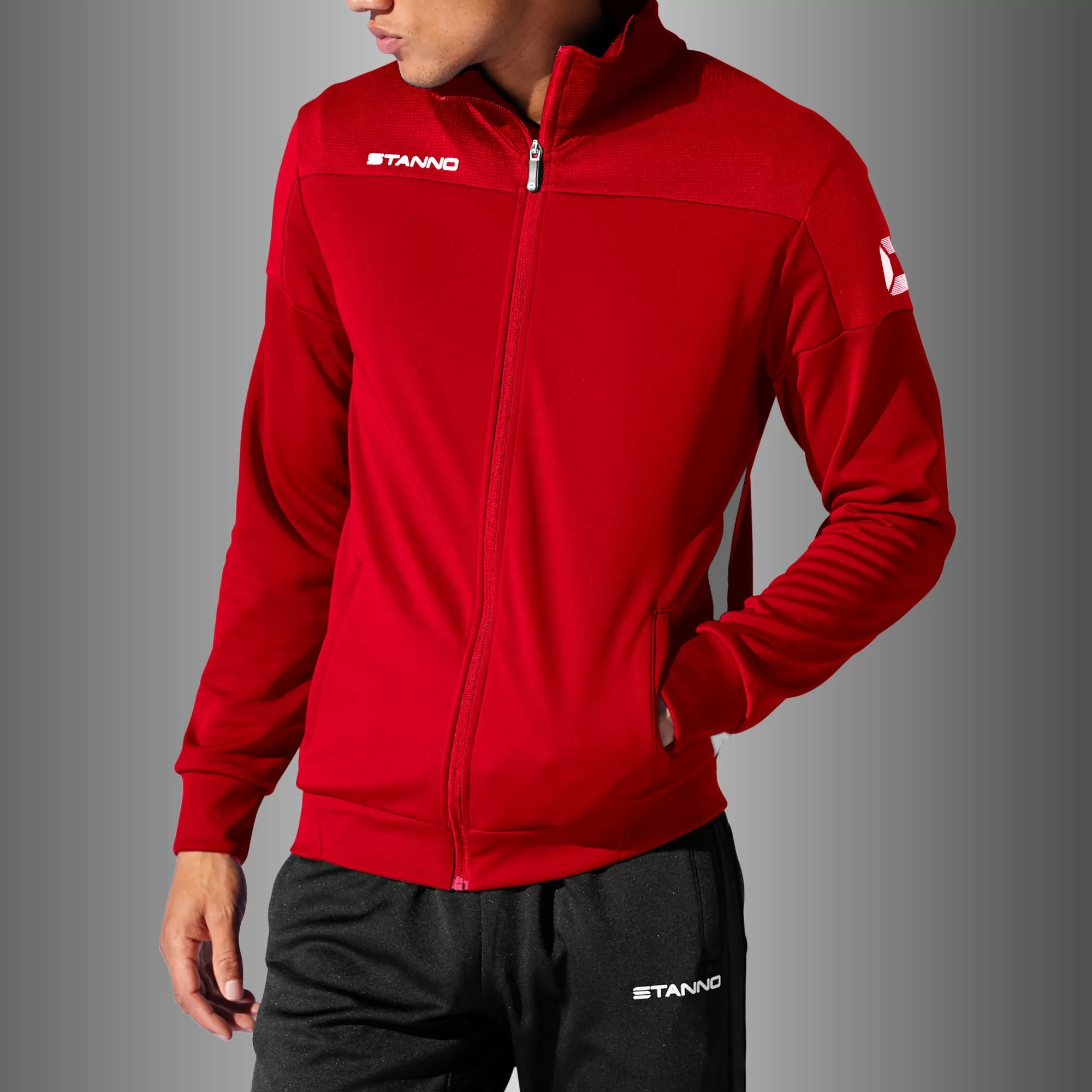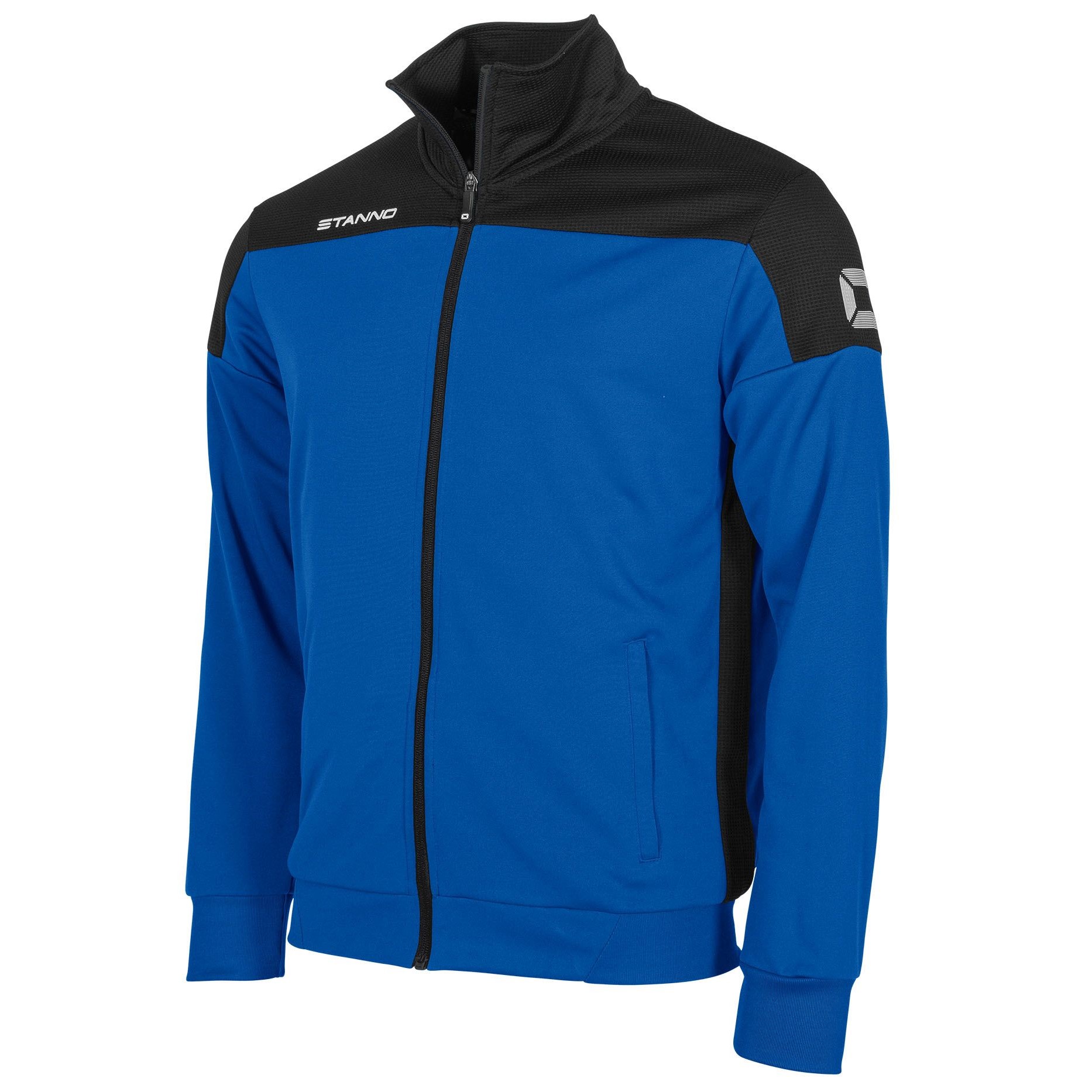This stylish jacket, part of the Stanno Pride collection, is comfortable to wear before and after exercise or during your warm up. The jacket has two slit pockets on the front and connecting machets of elastic rib material. The top and sides are made of ventilating mesh that feels light and airy. The waist is also finished with an elastic rib material, which ensures an optimal fit.