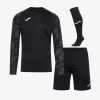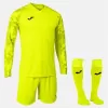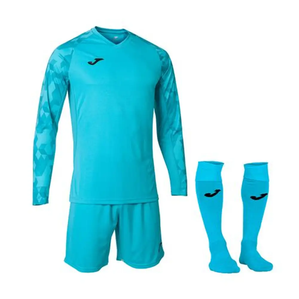 The long-sleeved shirt has a round neck with an interior covertape to prevent chafing in that area. It presents an innovative sublimated design on the upper part that gives an aesthetic and modern touch. It has a specific goalkeeper cut that guarantees absolute freedom of movement to intercept each shot. Shorts with an elastic waist that adjusts to the physical shape of the goalkeeper with a fixing effect on the garment. With adjustable waistband by internal drawstring. It stands out for its smooth, single-colour design. Both pieces have been made with light and resistant fabric, as well as breathable, so you’ll stay cool and dry at all times. The socks have been made with an elastic, comfortable and breathable fabric, which prevents them from slipping down the leg during matches or training sessions, achieving greater comfort. Joma logo embroidered on the shirt and pants.