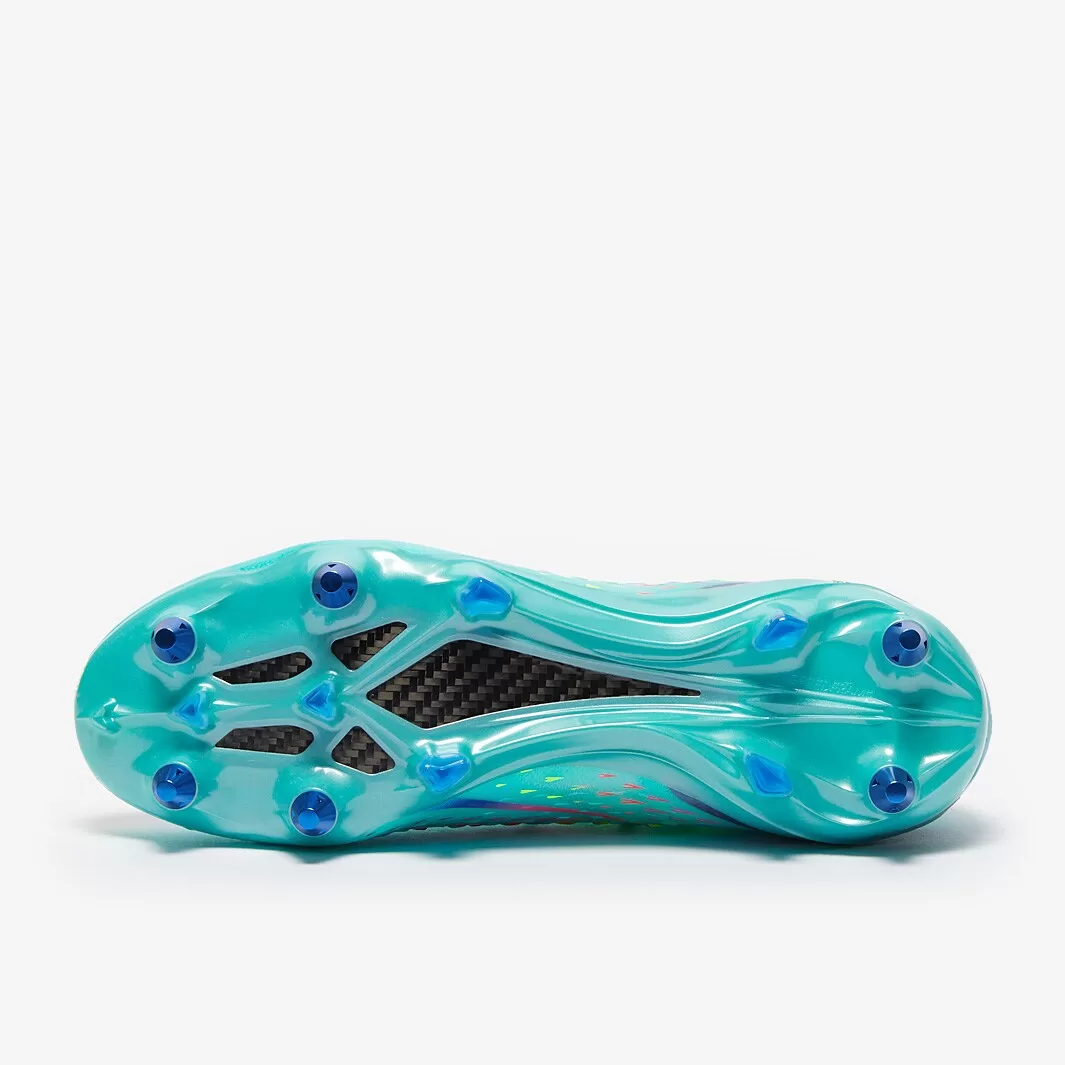 It’s all about attacking space, with a carbon propulsion system and a generative stud design combining to launch you into action the instant a gap appears. At the rear, a carbon heel lock with stability wings provides the downforce to keep you secure and balanced at top speed. The Speedskin upper features a lightweight, sustainably made layer of Primeknit with a textured outer casing for quick, decisive manipulation of the ball, while the support cage underneath powers you up from the inside for explosive moves.
