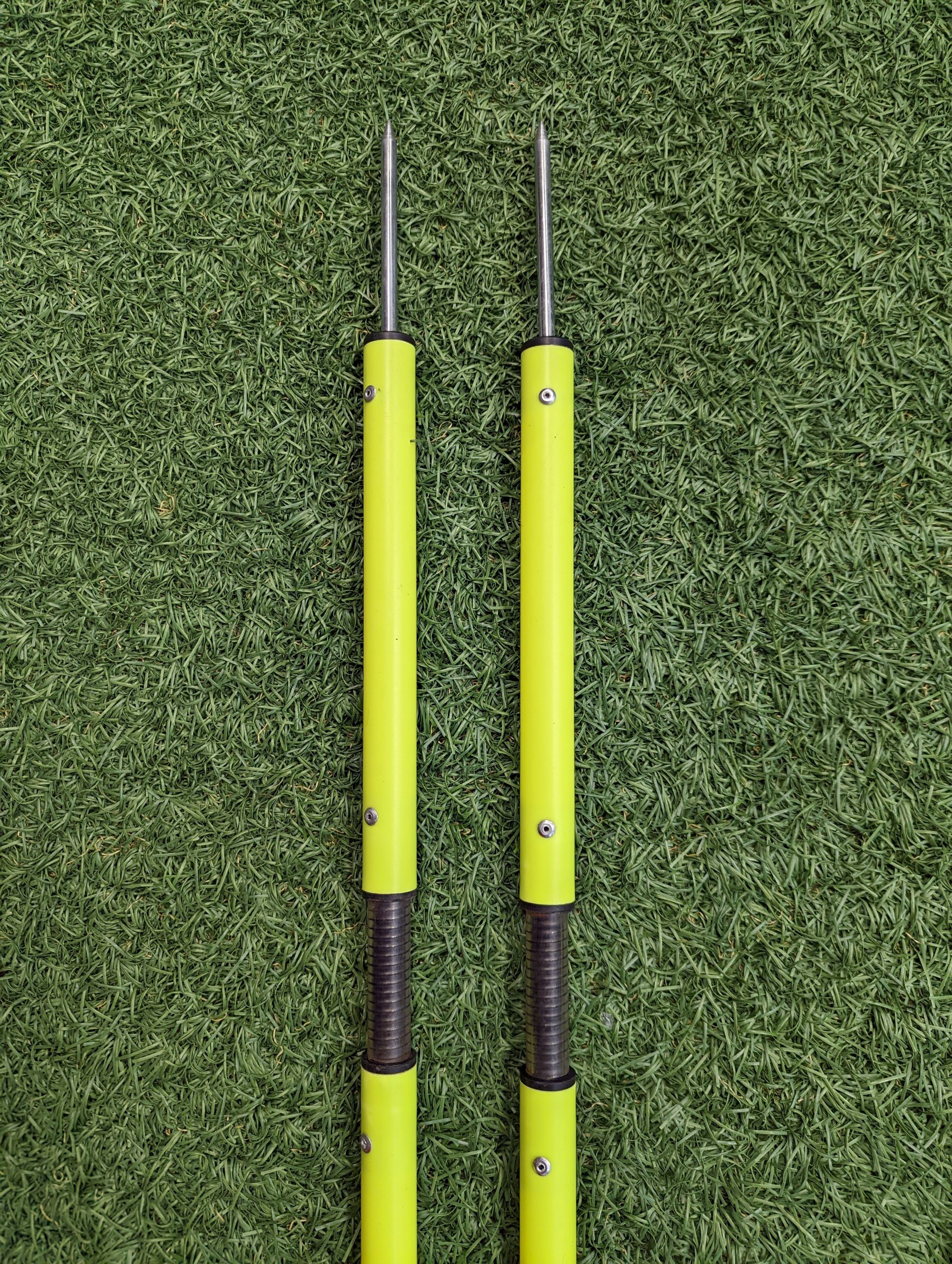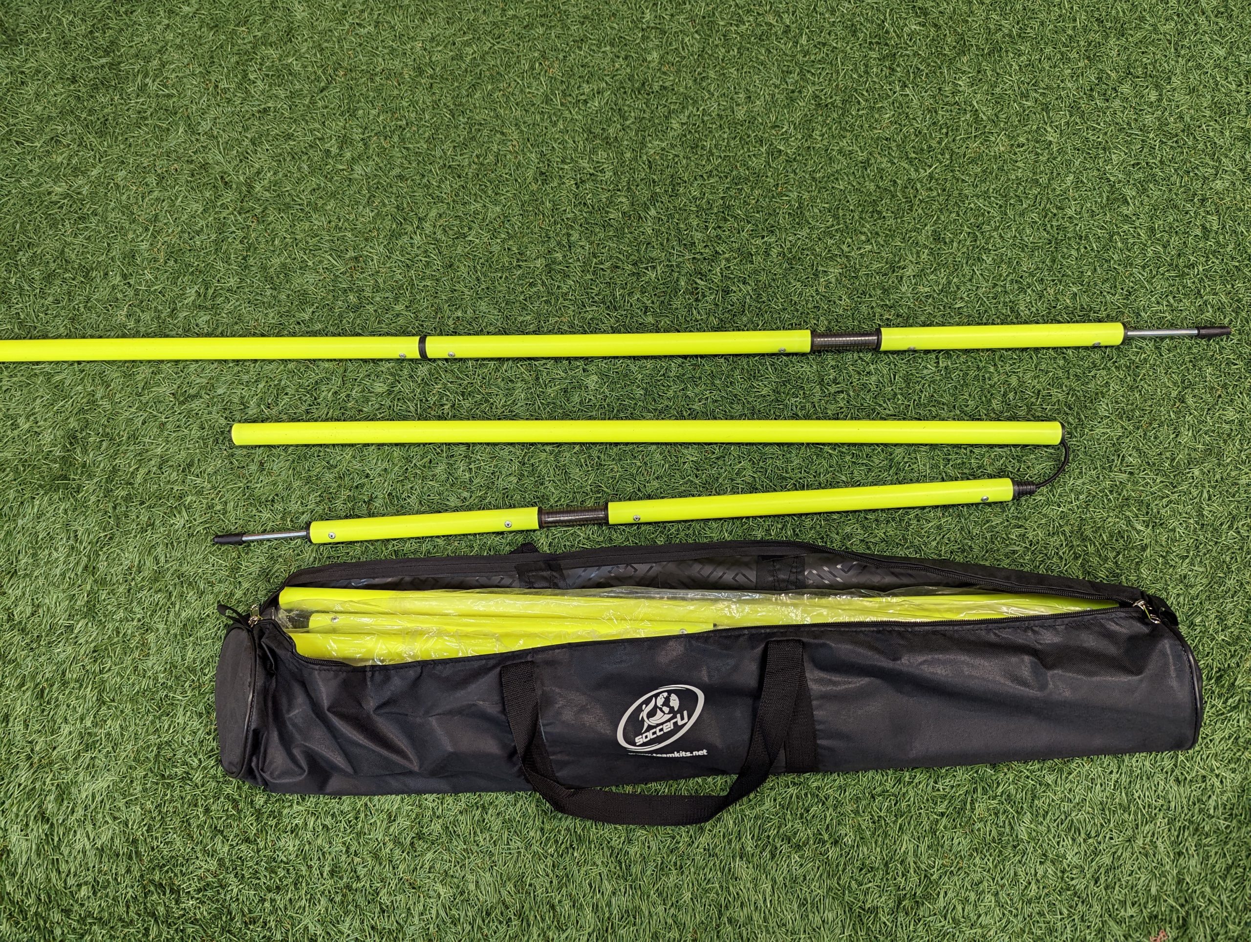 Are your Technical Directors and Coaches, tired of trying to lug around 6′ long agility poles? Car not big enough to travel with poles to practice? Solution: Our collapsible flexi spring spiked Slalom Poles. These poles are easily screwed to put together and unscrewed to collapse with internal heavy elastic to keep all together. Elevated Flexi Spring protects Poles and Players during any contact. Slalom Poles are used to help increase a soccer player’s foot speed, basic ball control skills and reaction time. Comes with a Carry Bag that holds 10 – 6’poles collapsed into an easily manageable 3 ft size!!